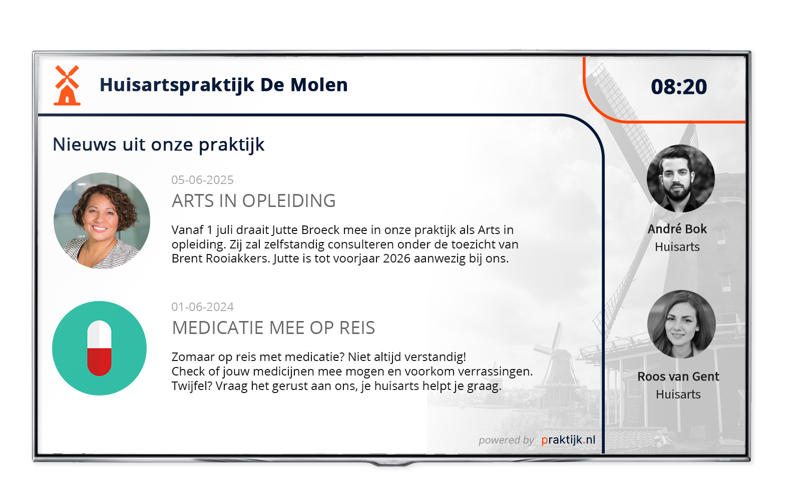 Heeft u uw praktijkwebsite via Praktijk.nl? Dan profiteert van maandelijks voordeel én synchroniseert u uw praktijknieuws en het overzicht van uw medewerkers in de praktijk naadloos tussen uw website en tv-scherm. Wilt u meer weten? Vraag gerust een online demonstratie aan.